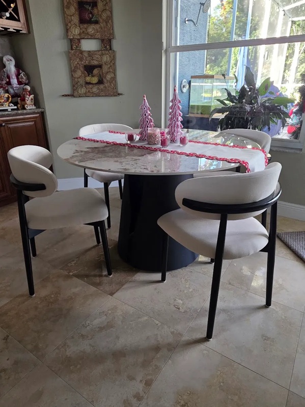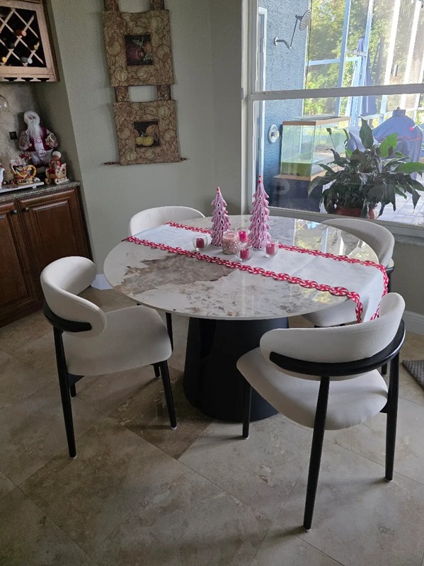 We needed something that wouldn’t take up too much space but still look modern, and this works perfectly. The round shape makes the room feel less crowded and the table itself looks very clean. Chairs are comfortable enough for everyday use, even when we sit longer.