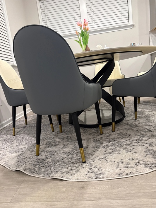 Upholstered in high quality material, the chairs provide a soft, smooth finish that is both durable and easy to maintain. The combination of lighter inner seating surfaces with darker outer panels creates a layered and contemporary look, adding depth to the overall design. The legs are finished in black with subtle metallic accents, complementing the base of the table while adding a refined detail.